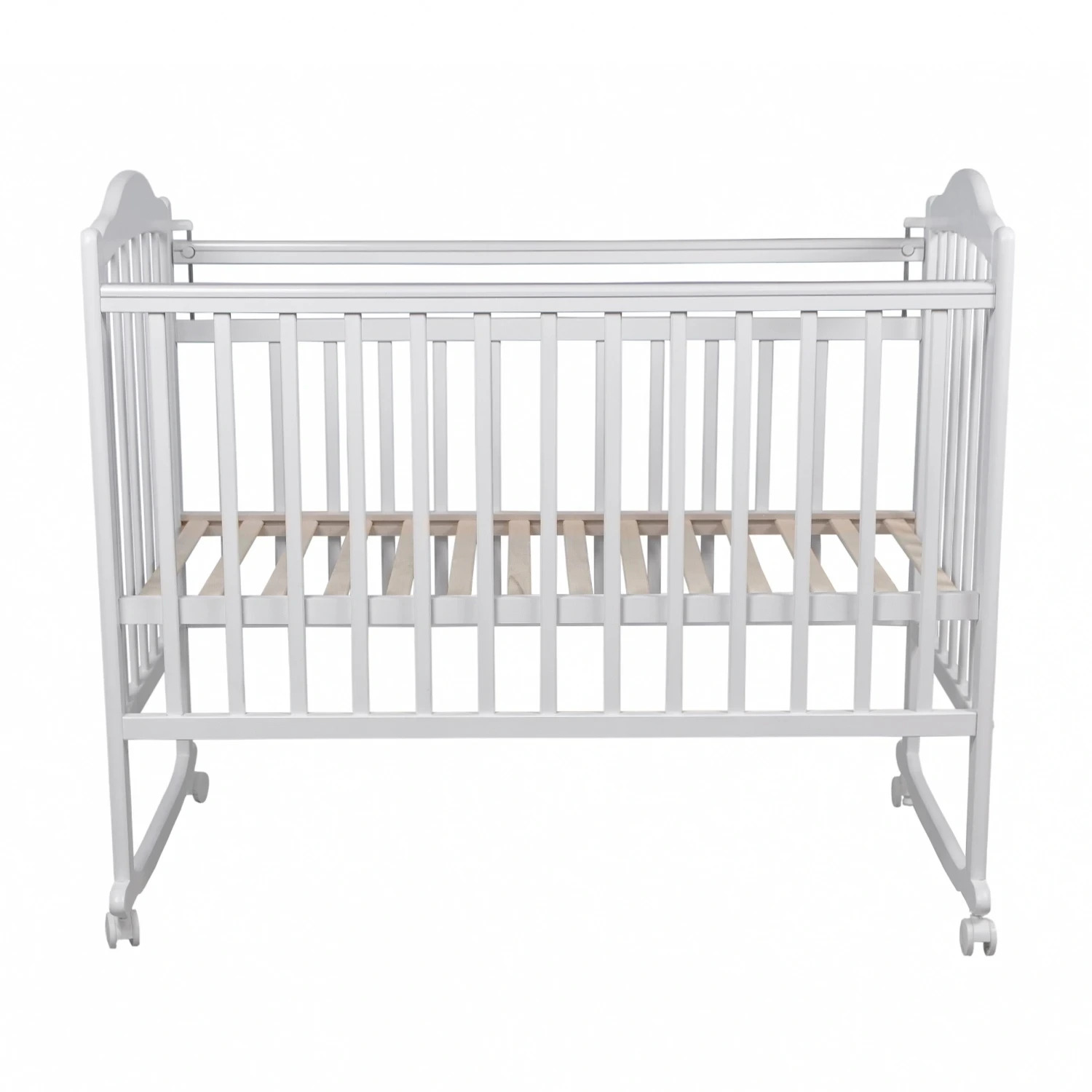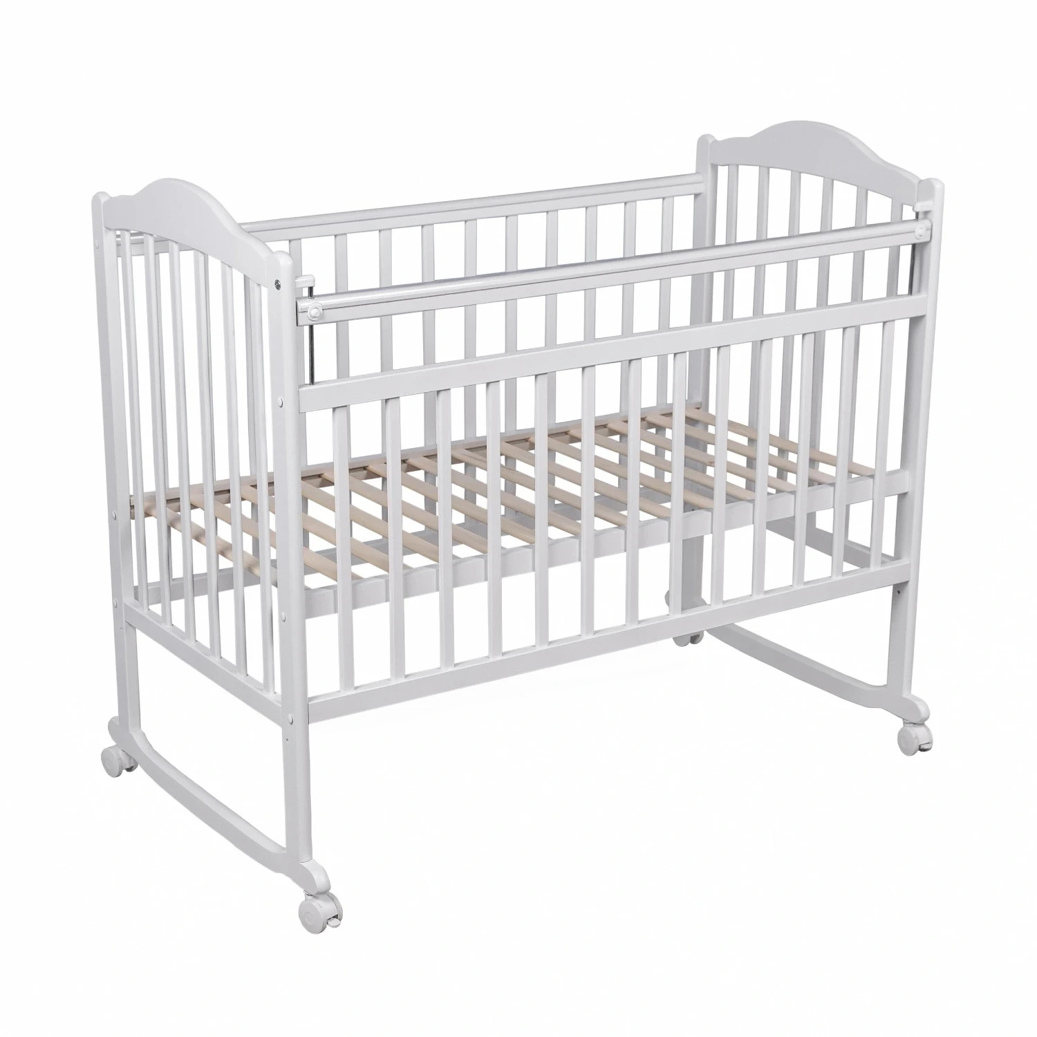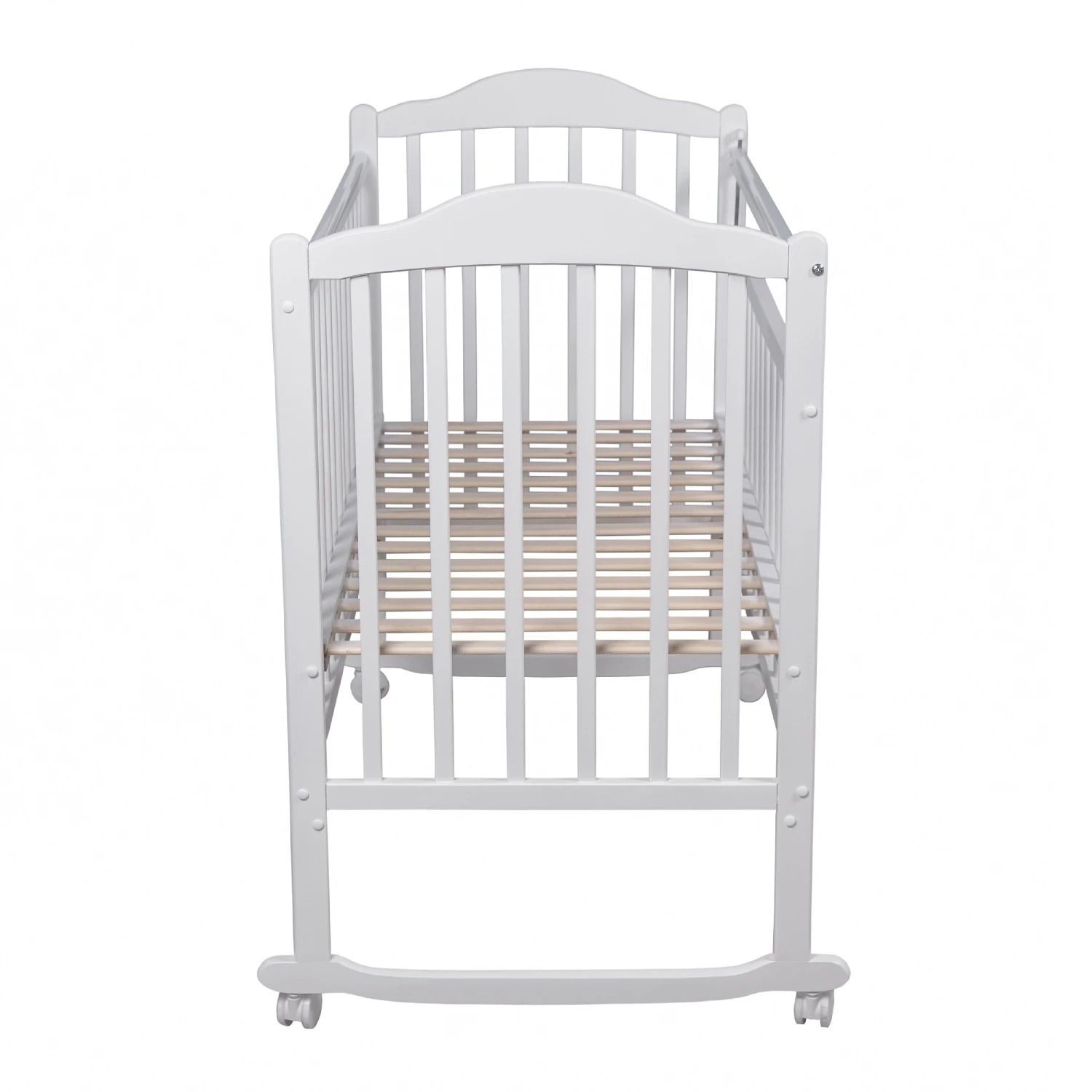 Возможны два варианта сборки кроватки: на колесах для удобного передвижения кровати, и качалка - для укачивания малыша. Фигурная спинка придает модели элегантный внешний вид, а опускающаяся планка обеспечивает комфортный доступ к ребенку. Реечное ортопедическое ложе поддерживает правильное положение тела малыша и способствует здоровому развитию.